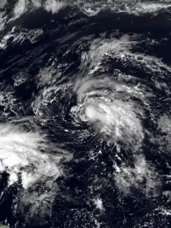 The origins of Tropical Storm Edouard are unclear, but an area of persistent organized storms formed in the Bay of Campeche, which strengthened into a tropical storm on September 14. Edouard rapidly intensified, with wind speeds reaching 65 miles per hour (105 km/h) in 18 hours as a faint eye feature became visible. Following its strengthening, Edouard dissipated even more quickly, degenerating into an area of thunderstorms the next day.[36] The remnants of Edouard moved over land near the port of Veracruz.[37]