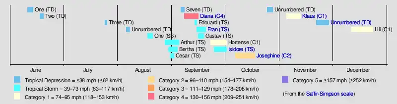 Six storms during the season had subtropical characteristics at some point in their track, those being Subtropical Storm One,[10] Tropical Storm Cesar,[11] Hurricane Hortense,[12] Hurricane Josephine,[13] Hurricane Klaus,[14] and Hurricane Lili.[15]