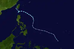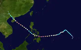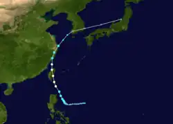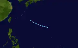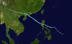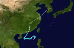 Development of this system was slow within the eastern portion of the monsoon trough. By midday on July 2, the disturbance was first noted about 1,020 kilometres (630 mi) southwest of Guam. The system moved northwest for much of its life cycle, initially following Alex and then the southwest side of the subtropical ridge. A broad tropical depression formed on the afternoon on July 5 within the disturbed weather area, weakening as it passed over Luzon. Late on July 7, ship reports indicated the system had become a tropical storm. The cyclone moved within the radar fence of Hong Kong near its peak intensity before making landfall 250 kilometres (160 mi) to its west-southwest during the early afternoon of July 9. Winds gusted to 70 knots (130 km/h) at Green Island.[1] Weakening over the topography of China was rapid thereafter, and the system dissipated by early on July 10.[6]