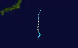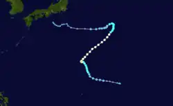 Initiated by the tropical tropospheric trough (TUTT), an area of convection was first noted southeast of the upper trough in an area with favorable upper level divergence on July 2 near 18N 168E. The disturbance moved west-southwest and evolved into a tropical depression late on July 6 and a tropical storm soon after. The cyclone moved northwest towards a break in the subtropical ridge and reached typhoon status late on July 9 forming a large eye about 55 kilometres (34 mi) in diameter. Rapid development continued for another 12 hours as it slowly moved through the ridge axis. The cyclone turned northeast late on July 10 as it began to be sheared significantly from the northwest. Shearing relented on July 11 allowing the eye to reform, this time 75 kilometres (47 mi) wide. As the typhoon progressed more poleward, increased vertical wind shear and the entrainment of cooler and drier air began its extratropical transition. By late on July 14, Cary had become an extratropical cyclone. The nontropical system then moved westward, eventually dissipating south of Japan.[7]