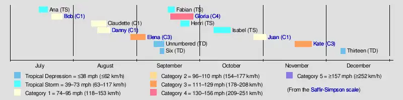 Tropical cyclogenesis in the 1985 Atlantic hurricane season began with the development Tropical Storm Ana on July 15. Less than a week later, Hurricane Bob developed in the Gulf of Mexico. Activity briefly halted until Hurricane Claudette formed offshore Georgia on August 9. The month of August also featured Hurricanes Danny and Elena. As September is the climatological peak of hurricane season, it was the most active month.[9] Five tropical cyclones developed, including two tropical depressions,[10] Tropical Storms Fabian and Henri, and Hurricane Gloria. Thereafter, activity began to slow, with Tropical Storm Isabel and Hurricane Juan in October. Another named storm, Hurricane Kate, developed near Puerto Rico on November 15.[9] The final tropical cyclone of the season, Tropical Depression Thirteen, developed in the Caribbean Sea on December 7 and dissipated by late on December 9.[10]