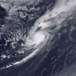 At 0700 UTC on September 17, the depression was operationally upgraded to a tropical storm. Fabian strengthened further and at 0945 UTC on that day, the storm attained its peak intensity with winds of 65 mph (105 km/h) and a minimum atmospheric pressure of 992 mbar (29.3 inHg). A low-pressure area began developing along the frontal trough, causing the storm to accelerate eastward. The ship Vant recorded winds as high as 80 mph (130 km/h) while passing between Fabian and the developing low pressure system on September 17 and September 18. At around 1800 UTC on September 19, Fabian was absorbed by the low-pressure area about 405 miles (652 km) southeast of Flores Island, Azores.[51]