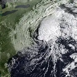 The storm brought strong winds to eastern North Carolina, with sustained winds up to 98 mph (158 km/h) and gusts as high as 120 mph (190 km/h).[55] Wind damage to trees and structures were reported as far as 30 mi (48 km) inland. One man was killed after a tree fell on his mobile home near Havelock.[56] Storm surge amounts ranging from 4 to 8 feet (1.2 to 2.4 m) also caused flood damage to numerous homes along the Outer Banks.[55] In New York, wind gusts up to 100 mph (160 km/h) on Long Island damaged or destroyed hundreds of homes and businesses. Hundreds of aircraft sustained damage. Thousands of trees were knocked over, which struck power lines, leaving about 1.5 million people – roughly two-thirds of Long Island – without electricity. Storm tides also caused severe beach erosion, flooded hundreds of streets, and damaged or destroyed hundreds of boats. In Connecticut, thousands of trees downed by strong winds struck power lines, leaving up to 727,000 people without electricity. Along the coast, hundreds of small crafts and pleasure crafts were torn from their moorings. Additionally, a number of houses were inflicted flood damage from storm tides. Similar impact was reported in Massachusetts and Rhode Island.[56] Overall, Gloria caused 14 deaths and about $900 million in damage.[9][56]