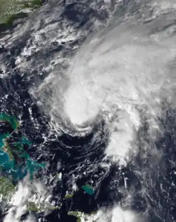 The interaction of an upper-level trough and a tropical wave spawned Tropical Storm Kate at 1800 UTC on November 15, while located northeast of Puerto Rico. Kate strengthened while moving westward and was upgraded to a hurricane about 24 hours later.[68] Early on November 19, the storm made landfall in Ciego de Ávila Province, Cuba with winds of 110 mph (175 km/h). It curved west-northwestward and weakened to a Category 1 hurricane before emerging into the Gulf of Mexico late on November 19. Kate turned northwestward and strengthened, peaking as a 120 mph (195 km/h) Category 3 hurricane on November 20.[69] However, it weakened to a Category 2 hurricane on November 21, several hours before making landfall near Mexico Beach, Florida. The storm quickly weakened inland and was downgraded to a tropical storm on the following day. It crossed the Southeastern United States and emerged into the Atlantic Ocean near Cape Fear, North Carolina on November 23. Kate re-curved east-southeastward, before becoming extratropical while located about halfway between the Outer Banks and Bermuda.[70]