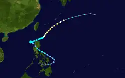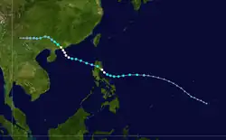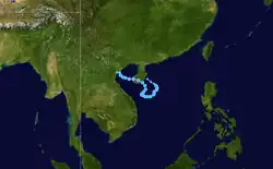 A tropical depression formed 1,050 kilometres (650 mi) east-southeast of Manila on July 4. Moving west-northwest, the system crossed the central Philippines on July 5, moving into the South China Sea on July 6. Moving more towards the north on July 7, the depression moved inland into southern China east of Hong Kong on July 8. In Hong Kong, winds gusted to 47 knots (87 km/h) at Tate's Cairn, where 114.1 millimetres (4.49 in) fell.[1] While Hong Kong considered it a tropical depression throughout its life cycle, PAGASA named the system and considered it a tropical storm.[7]