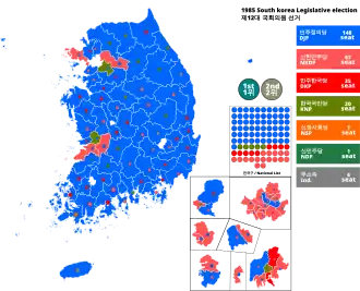 Legislative elections were held in South Korea on 12 February 1985.[1] The result was a victory for the Democratic Justice Party, which won 148 of the 276 seats in the National Assembly. Voter turnout was 84.6%.
