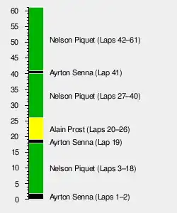 Senna led from pole position but was soon under threat from the Williams pair. Nigel Mansell spun off the track on the opening lap after contact with Senna, but Piquet was in the lead by lap three. As pitstops began it started to look as though Alain Prost (McLaren MP4/2C) might pull a surprise by only pitting once and snatching the win away from the Brazilians[1] but that came to an end along with Prost's TAG-Porsche engine just past half-distance.[2]