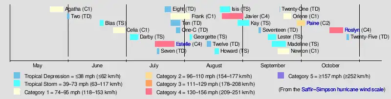 Several storms throughout the season affected land. Hurricane Estelle passed south of Hawaii, resulting in $2 million in damage and two deaths.[nb 1] Hurricanes Newton, Paine and Roslyn each struck Northwestern Mexico. While damage was minimal from these three systems near their location of landfall, Paine brought considerable flooding to the Great Plains. The overall flooding event resulted in $350 million in damage, with the worst effects being recorded in Oklahoma. Hurricane Roslyn was the strongest storm of the season, attaining peak winds of 145 mph (233 km/h).[2]