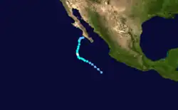 Otis originated from the a tropical disturbance embedded in the monsoon trough. It moved over the warm waters south of the Mexican Riviera from September 17 to September 19. At 0000 UTC September 20, the disturbance was upgraded into Tropical Depression Nineteen-E while moving to the northwest.[5] It strengthened into a tropical storm later that day while located 950 mi (1,530 km) southwest of La Paz.[3] Eighteen hours later on September 21, Otis intensified into a hurricane.[5] It also began to turn back to the west and began to undergo a period of rapid deepening. On September 22, Otis reached its peak windspeed of 115 mph (185 km/h).[5] It would oscillate irregularly between that strength and Category 2 intensity until September 24.[3] That day, it began accelerating to the west as it lost strength due to increased wind shear and decreasing ocean temperature.[5] Otis fell to tropical storm strength on September 25 and a depression on September 26, and dissipated shortly after that.[3]