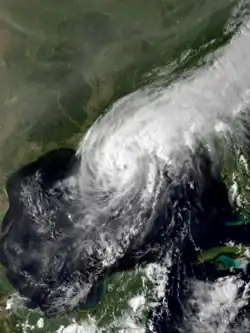The season's first named storm originated on August 4 within a weak trough of low pressure that formed off the coast of South Carolina. The next day a low level circulation was detected by satellite, indicating that a tropical depression was forming. By August 6 the storm was designated the second tropical depression of the season.[6] An approaching weak frontal trough pushed the depression northeastward and enhanced its upper-level outflow. On August 7 the system was designated Tropical Storm Alberto at 41.5°N, while located just south of Nantucket, Massachusetts, becoming the northernmost system to intensify into a tropical storm on record.[17][nb 2] The storm accelerated northeastward at 29 mph (47 km/h) and struck western Nova Scotia that evening with little impact.[17][18] On August 8 Alberto became extratropical over the cold waters of the Gulf of Saint Lawrence. Shortly thereafter it dissipated just north of Newfoundland.[17]