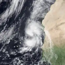 A well-organized disturbance moved off the African coast on September 6 and rapidly developed into Tropical Depression Eleven. The NHC began issuing advisories on September 8 while it was 350 mi (560 km) northeast of Cape Verde. An after-the-fact review of satellite and ship reports indicated that the depression reached tropical storm-strength on September 7.[44][45] However, because of its extreme eastern track, the storm's observational track did not include this information.