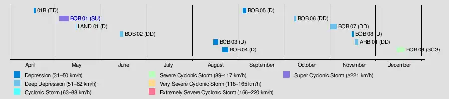 | ARB 01 | November 16–18 | Deep Depression | 55 km/h (35 mph) | 1,007 hPa (29.74 inHg) | None | Unknown | Unknown | [9] |