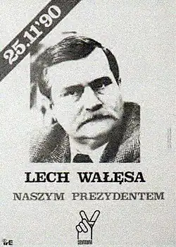 Presidential elections were held in Poland on 25 November 1990, with a second round on 9 December.[1] They were the first direct presidential elections in the history of Poland, and the first free presidential elections since the May Coup of 1926. Before World War II, presidents were elected by the Sejm. From 1952 to 1989—the bulk of the Communist era—the presidency did not exist as a separate institution, and most of its functions were fulfilled by the State Council of Poland, whose chairman was considered the equivalent of a president.
