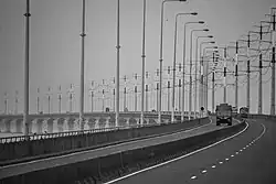 The road transport sector experienced rapid changes in the 1990s. Town services as well as inter-city bus transport and private taxicab services significantly improved through introduction of many large bodied modern buses.[11] There were only 133,253 motor vehicles in Bangladesh in 1985 and the number rose to 405,919 in 1999.[12] The construction of Bangabandhu Jamuna Bridge was completed in the second half of the 1990s and the bridge was opened to traffic in 1998. Other important bridges constructed in the 1990s included the Dhalla bridge, the 4th Bangladesh-China Friendship bridge, the Langalbanda bridge and the second Buriganga bridge that linked the national highways and contributed to substantial increase in road traffic.[12] Although the railway network benefited from the increased connectivity from Jamuna Bridge, the sector continued to lose share. The share of the railway sector in passenger traffic declined from 50% in the 1960s to 12% in 1990s and in freight traffic over the same period from 40% to 7%. Due to small volume of traffic and resulting low profitability Faridpur-Pukuria, Bheramara-Raita, Feni-Belonia, and Rupsa-Bagerhat sections of the railway line were closed between 1994 and 1997.[13] Air Transport sector also did not grow much in this decade. As of 1989, there were 14,600 registered carrier departures worldwide which came down to 5,900 by 1999. During the same period number of passenger carried slightly increased from 1.00 million to about 1.22 million per annum.[4]