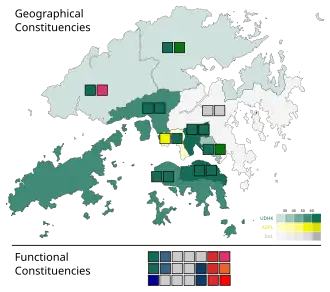 | United Democrats of Hong Kong | 618,209 | 45.15 | 14 | 12 | 15,208 | 66.46 | 3 | 2 | 14 | ||
