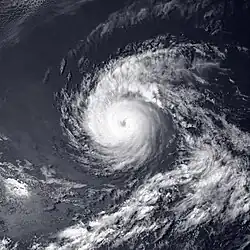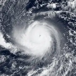 However, a well-defined eye reappeared on satellite imagery in the system and Kevin re-intensified to a low-end Category 3 hurricane with maximum winds of 115 mph (185 km/h) and a minimum pressure of 960 mbar (28 inHg) on October 7. But this was short-lived and on October 8 the hurricane began to weaken again and on October 9 it had entered into the Central Pacific basin as a waning Category 1 hurricane.[37] After this crossing, it was subsequently downgraded to storm strength the same day and on October 11, to a depression. It dissipated as a tropical cyclone that same day. The remnant circulation did persist a while longer as it slowly drifted north to finally lose its identity late on October 14.[19] Despite its long life, Hurricane Kevin caused no damage or casualties.[37] Because Kevin passed north of Hawaii, its only effect on land was increased trade winds.[19]