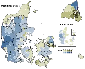 A referendum on the Maastricht Treaty for the founding of the European Union was held in Denmark on 2 June 1992.[1] The treaty was rejected by 50.7% of voters with a turnout of 83.1%.[2] This meant a serious hurdle on the way in the process of further European integration, which nevertheless did continue because all twelve member states did want to ratify.