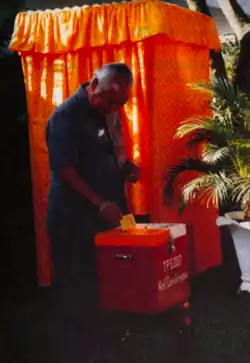 In response, Indonesian attorney general Singgih promised an investigation into alleged fraud. The police probed over 100 polling sites in Jakarta alone, and Singgih conceded that while there were some mistakes in the election process. However, he maintained that these errors were merely human errors, not actual fraud.[26] Meanwhile, Coordinating Minister for politics and security, Sudomo, lashed out against these accusations, and threatened that anyone who undermines the integrity of the election will be put in prison for up to five years.[27] When the PDI claimed to have evidence of voting irregularities, Sudomo wrote it off as 'commonplace' and 'a part of politics'.[28]