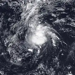 The system continued intensifying until reaching hurricane status at 00:00 UTC on January 30, and it reached major hurricane status on February 2, reaching maximum sustained winds of 115 mph (185 km/h).[7] However, unfavorable wind shear began taking a toll on the storm, causing it to rapidly weaken. Ekeka crossed the International Date Line as a weakened tropical storm, and shortly thereafter degraded to tropical depression status. Ekeka continued westward, passing through the Marshall Islands and later over Chuuk, before dissipating on February 9 about 310 mi (500 km) off the north coast of Papua New Guinea.[6]