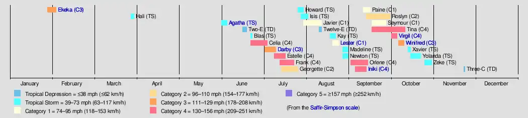 The most notable storm was Hurricane Iniki, which caused billions of dollars of damage to the Hawaiian Islands, primarily in Kauai, along with six fatalities. Hurricanes Lester, Virgil, Winifred, and Orlene also made landfall and killed several people, but were significantly less destructive. Hurricane Darby and Tropical Storm Agatha brought rains and more destruction to Mexico, without making landfall. Hurricane Tina was, in addition to being the strongest storm of the year, the longest-lasting Pacific hurricane at the time.