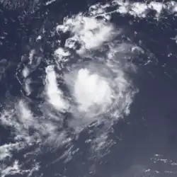 The origins of Hurricane Frank were from a tropical wave that exited the coast of Africa on July 1. After reaching the Pacific, it developed an area of disturbed weather on July 9 off the southern Mexican coast. Continuing westward, the system developed into Tropical Depression Seven-E on July 13 about 660 mi (1,060 km) south-southeast of the southern tip of the Baja California peninsula.[39] The depression intensified with favorable water temperatures and well-defined outflow. Based on estimates from satellite imagery, the depression intensified into Tropical Storm Frank on July 14.[40] For about a day, the storm tracked generally northwestward before turning to the west due to a building ridge north of the system.[39] An eye developed within the Central Dense Overcast, a large mass of deep convection, late on July 14. Additional intensification was expected, and Frank was predicted to become a major hurricane within 48 hours.[41] The next day, Frank attained hurricane status.[39]