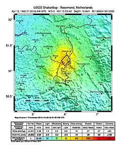 The 1992 Roermond earthquake occurred on 13 April, around 3:20 AM (1:20 UTC) with a moment magnitude of 5.3 and a maximum Mercalli intensity of VIII (Severe).[2] Striking on the Peel Boundary Fault, a normal fault near Roermond, it was the strongest recorded earthquake in the Netherlands and in Northwestern Europe, and caused substantial damage to older buildings in the Netherlands and adjacent countries of Belgium and Germany. A series of aftershocks followed.