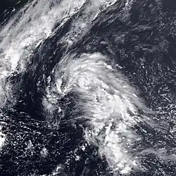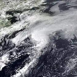 Tropical Depression Ten developed about 185 mi (298 km) southeast of Bermuda at 18:00 UTC on September 29.[10] Initially, convection associated with the depression was confined to north and east of the center.[64] The depression was difficult to track, though wind observations in Bermuda suggested that it passed just north of the island between 0300 and 07:00 UTC on September 30. Although no intensification was predicted, the National Hurricane Center noted that interaction with the approaching cold front could result in baroclinic strengthening.[65] The depression did not organize further and merged with the cold front at 00:00 UTC on October 1.[10]