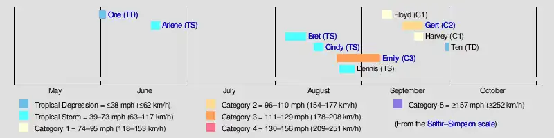 Tropical cyclogenesis in the 1993 Atlantic hurricane season began with the development of Tropical Depression One on May 31.[7] However, in the following two months, minimal activity occurred, with only one named storm, Arlene, in June. August was the most active month, with four systems developing: Tropical Storms Bret, Cindy, and Dennis, as well as Hurricane Emily.[8] September, normally the climatological peak of hurricane season,[11] had only three named storms form: Hurricanes Floyd, Gert, and Harvey.[8] The final Atlantic tropical cyclone of 1993, Tropical Depression Ten, became extratropical on September 30, two months before the official end of the season on November 30.[7][10]