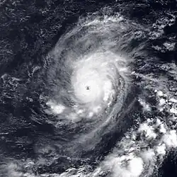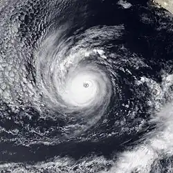 On August 30, a tropical disturbance developed south of Panama. Around 12:00 UTC on September 5, the system organized into a tropical depression as thunderstorms coalesced into loosely defined rainbands. These bands increased in intensity over subsequent hours, signaling the cyclone's intensification into Tropical Storm Kenneth by 06:00 UTC on September 6. Over the coming days, the cyclone moved on a sinussoidal-like path across the East Pacific, alternating between west and west-northwest. On September 8, Kenneth attained hurricane strength, which was followed by its development into a major hurricane on September 10, shortly after an eye first appeared on satellite. Early the following day, it became a powerful Category 4 cyclone with peak winds of 150 mph (240 km/h).[39] Kenneth displayed a small but well-defined eye embedded within a very cold central dense overcast at this time.[40] Soon, the cyclone encountered cooler waters and southwesterly wind shear on its northwest trek,[41] which caused the system to decay. Kenneth dissipated at 00:00 UTC on September 18, though its remnant circulation persisted for a few more days.[39]