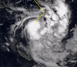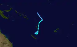 A persistent cloud mass east of the Solomon Islands evolved into a tropical depression on November 12, according to the FMS.[8][4] Located about 245 km (150 mi) northeast of Tikopia, the system had gale-force winds developing on its southern side.[8][9] The depression moved south-eastwards at first, before it turned southwestwards through Temotu Province towards Vanuatu, which prompted the FMS to start issuing special weather bulletins for the island nation during November 13.[8][9][10] Later that day, the JTWC initiated advisories, designating it Tropical Cyclone 01P. On November 14, the FMS named the system Vania, after it had become a category 1 tropical cyclone on the Australian scale.[8][9][11] Intensifying further, Vania moved through northern Vanuatu on November 15 as a category 2 tropical cyclone.[9] Later that day, the FMS predicted that Vania would become a hurricane and issued a hurricane warning; however, Vania had peaked as a category 2 tropical cyclone with peak 10-minute sustained windspeeds of between 100 km/h (65 mph), while the JTWC estimated that the system had peaked with 1-minute sustained windspeeds of 110 km/h (70 mph).[9][11][8] Over the next couple of days, the system stalled and started to move westwards, before the FMS and JTWC issued their final advisories on the cyclone during November 18, as it had weakened below tropical cyclone intensity and degenerated into a sheared depression to the north of New Caledonia.[8][9][11] The remnant low-level circulation was last noted during November 19, while they were located about 80 km (50 mi) to the west of Port Vila.[9]