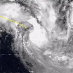 On December 30, the FMS reported that a tropical depression had developed about 860 km (535 mi) to the northeast of Pago Pago in American Samoa.[15] Over the next couple of days, the system moved towards the south-southeast and gradually developed further before the NPMOC designated the depression as Tropical Cyclone 05P.[11][5] During January 1, TCWC Nadi reported that the depression had developed into a Category 1 tropical cyclone and named it William as it passed near the Cook Island of Autitaki.[5] During the next day, William subsequently slowly accelerated as it passed near to or over several other Cook Islands and intensified into a Category 2 tropical cyclone.[5]