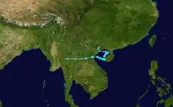 The first warning was issued a day later when the amount of deep convection near the centre increased as the depression neared the Philippines. While over the Philippine islands, a large mesoscale convective system (MCS) developed near the centre of the tropical depression, something that would occur again later while the system was west of Luzon.[15] Soon after the second MCS weakened, the system made landfall in central Vietnam on May 26, and quickly dissipated when inland.[4] The Hong Kong Observatory tracked this system as a weak tropical depression from May 25 UTC when it was about 520 km (320 mi) southeast of Xisha for about 24 hours before it dissipated.[1]