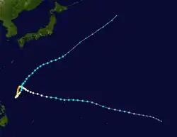 Page moved on a northwestward track for the next couple days while slowly strengthening.[11] Page was upgraded to a tropical storm by the JTWC late on May 12,[12] when it was located 500 kilometres (310 mi) north of Yap,[4] while the JMA first considered the system a tropical storm on May 13.[7] Late on May 13, Page suddenly slowed in forward speed and began turning to the northeast. On May 14, Page became a typhoon.[11][12] However, the JMA did not follow suit until 30 hours later.[7] Page reached its maximum intensity of 90 knots (170 km/h) and minimum pressure of 965 hectopascals (28.5 inHg) thirty hours after passing the point of recurvature.[11] Final warnings were issued by both the JTWC[11] and the JMA[7] early on May 18, as it began extratropical transition around 960 kilometres (600 mi) east-southeast of Tokyo.[11]