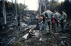 The Alaska Boeing E-3 Sentry accident was the September 22, 1995 crash of a United States Air Force Boeing E-3 Sentry airborne early warning aircraft with the loss of all 24 crewmembers on board.[2] The aircraft, serial number 77-0354 with callsign Yukla 27, hit birds on departure from Elmendorf Air Force Base in Alaska, United States. With the loss of thrust from both of the left engines, the aircraft crashed into a wooded area less than a mile from the end of the runway.[1]