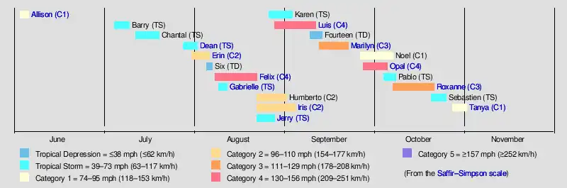 Tropical cyclogenesis in the 1995 Atlantic hurricane season began with the development of Hurricane Allison on June 2. The month of July was very active, with four tropical cyclones forming. This record of storms in July stood until the 2005 Atlantic hurricane season when five storms formed in July. A total of seven storms formed in August — Felix, Gabrielle, Humberto, Iris, Jerry, Karen, and Luis — tying the 1933 record for most in the month; this record was broken in the 2004 Atlantic hurricane season when eight named storms formed during August. Although September is the climatological peak of hurricane season, it was much less active than August. Four tropical cyclones developed in September, with Marilyn, Noel, and Opal eventually strengthening into hurricanes. Four tropical cyclones also formed in October; notably, Hurricane Roxanne developed in that month. The last storm of the season, Hurricane Tanya, developed later in October and eventually became extratropical on November 1.[12] This was the first time since forecasters began assigning given names to tropical storms in 1953 that names starting with the letters "O" through "T" were used.