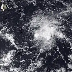 Genevieve slowly got better organized, and reached its peak intensity of 999 mbar (29.5 inHg) and 50 mph (80 km/h) on September 29.[34] The tropical storm then turned to the west-southwest as steering currents collapsed. The cyclone began a time of erratic motion, which included two loops. The erratic motion also exposed Genevieve to wind shear, and the tropical storm weakened to a tropical depression on October 1. On October 6, the shear temporarily weakened, and Tropical Depression Genevieve restrengthened into a tropical storm. The cyclone's wandering continued, and it entrained dry air. This dry air weakened the system to a depression for a second time on October 8, and Genevieve dissipated the next day. Brief flare-ups of convection could still be seen for a few days thereafter.[34]