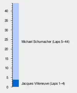 Of the front runners, both Williams drivers and Jean Alesi in the Benetton - alongside Villeneuve on the front row - started on full wet tyres while the others started on intermediates. The safety car circulated for the first three laps, and at the end of lap 4 - the first proper racing lap - Villeneuve continued to lead from Alesi and Schumacher. However, this was where the German driver started to take control of the race. He made a brave pass inside Alesi at the La Source hairpin at the start of lap 5, then overtook Villeneuve at the Rivage loop on the same lap. By the end of the lap he was already 5.8 seconds ahead, and on the next lap he stretched this lead to 16.9 seconds, with Giancarlo Fisichella - whose Jordan had also started on intermediates - moving into second after Villeneuve unexpectedly pitted.[4]