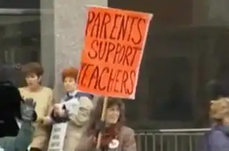 Beginning on October 27, 1997, over 126,000 public and Catholic school teachers, principals, and vice principals participated in a province-wide walkout. At the time, the action was the largest teachers' strike to ever occur in North America.[7] More than 2.1 million students were affected; nearly all of the province's 4,742 public schools were closed, with a few remaining open under the supervision of non-teaching staff.[7] While the action was referred to as a "strike" in public discourse, it was technically a protest, as the demonstrators were opposing actions by the government rather than the school boards they were employed by;[9] consequently, the demonstrators did not earn strike pay for the duration of the action.[13] The strike was supported by the Canadian Auto Workers (CAW) and Canadian Union of Public Employees (CUPE), with CUPE president Sid Ryan calling for a general strike in support of the teachers.[13][14]