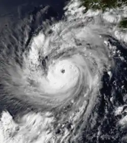 Located in an area conducive to further development, Darby attained hurricane status on July 24, subsequent to the development of a 17-mile (27 km)-wide eye.[17] The eye became more distinct while surrounded by an area of deep convection, and on July 25 the hurricane reached peak winds of 115 mph (185 km/h) about 850 miles (1,370 km) southwest of Cabo San Lucas.[18] The eye soon disappeared on satellite imagery, believed to be from an eyewall replacement cycle, and Darby's winds weakened to about 105 mph (169 km/h). A 25-mile (40 km) eye next developed, and on July 26, the hurricane re-intensified to reach peak winds of 115 mph (185 km/h).[17] For a 30-hour period, Darby attained the characteristics of an annular hurricane, retaining a well-defined structure with few banding features for an extended period.[19] The hurricane began to weaken while entering an area of cooler water and increased wind shear, and after crossing into the jurisdiction of the Central Pacific Hurricane Center, Darby weakened to a tropical storm on July 29. The storm degenerated into a tropical depression on July 31, and early on August 1, Darby dissipated a moderate distance north of the Hawaiian Islands. It never affected land.[17]