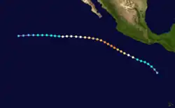 A tropical wave was first observed in the eastern Pacific Ocean on August 4 in association with the Intertropical Convergence Zone. It tracked westward, and by August 9 a low-level circulation formed well to the south of Mexico. Banding features increased as the system detached from the Intertropical Convergence Zone, and on August 11, the system developed into Tropical Depression Eight-E about 730 miles (1,170 km) southwest of Acapulco.[30] On becoming a tropical cyclone, the depression maintained an area of concentrated deep convection near the center. The National Hurricane Center initially predicted that the depression would slowly intensify and reach winds of 70 mph (110 km/h) within 72 hours. For much of the rest of the storm's duration, the National Hurricane Center underestimated the intensity of the cyclone.[31]