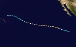 The depression tracked steadily northwestward, caused by its location along the western periphery of a subtropical ridge. It would retain that direction for most of its remaining duration. Late on August 11, it intensified into Tropical Storm Georgette, and two days later it attained hurricane status after developing a 40-mile (64 km) eye about 615 miles (990 km) south-southwest of Cabo San Lucas.[30] The eye became increasingly distinct while banding features became very well organized.[32] Georgette attained peak winds of 115 mph (185 km/h) while centered 690 miles (1,110 km) west-southwest of the southern tip of Baja California.[30] The hurricane soon moved over cooler water,[32] and began to weaken as convection warmed and decreased. On August 16, it degenerated into a tropical storm, and Georgette dissipated on August 17 without ever affecting land.[30]
