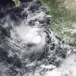 Early on October 9, the center of the storm passed within about 85 miles (137 km) of the coastline between Manzanillo and Cabo Corrientes.[31] The storm then curved west-northwestward and at 1800 UTC on October 9, Irwin attained peaked with winds of 60 mph (97 km/h). Stable air and increasing wind shear caused Irwin to weaken and fall to tropical depression intensity early on October 11. About 12 hours later, the storm dissipated while located about 405 miles (652 km) southwest of Cabo San Lucas.[31] While passing offshore, Irwin brought patches of heavy rainfall to some areas of Mexico, peaking at 9.92 inches (252 mm) in Coahuayutla de Guerrero, Guerrero.[12]