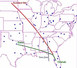 - Note: all times are presented in 24-hour format. Because the flight took place in both the Eastern Time zone – Eastern Daylight Time (EDT) – and the Central Time zone – Central Daylight Time (CDT) – all times are given in this article in Coordinated Universal Time (which is indicated by the time followed by the letters UTC).