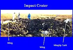 Impact occurred approximately 17:13 UTC, or 12:13 local, after a total flight time of 3 hours, 54 minutes, with the aircraft hitting the ground at nearly supersonic speed and at an extreme angle.[12] The Learjet crashed in South Dakota, just outside Mina in Edmunds County, on relatively flat ground and left a crater 42 feet (13 m) long, 21 feet (6.4 m) wide, and 8 feet (2.4 m) deep. The aircraft was destroyed.[2]