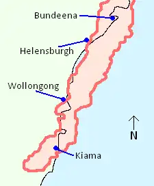 The storm cell formed at 4:25 pm AEST to the north of Nowra, roughly 115 km (71 mi) south-southwest of Sydney. After forming, it initially headed towards the coast in a northeasterly direction. The cell passed just to the west of Kiama at around 5:15 pm and gained a 'severe' classification from the Bureau of Meteorology at the same time.[15] 'Severe' is a classification used by the Bureau of Meteorology for thunderstorms which meet a specific criteria, namely producing hailstones with a diameter of 2 cm (0.8 in) or more, wind gusts of 90 km/h (56 mph) or greater and flash flooding, or tornadoes. This classification is also used by the Bureau to classify the attributes of a storm at any given time during its life.[7][16]