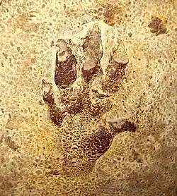 The 1830s also saw the discovery and investigation of unusual hand-shaped footprints from Triassic rocks in Germany that were later named Chirotherium. The identification of the Chirotherium trackmaker proved elusive and suggestions from researchers included everything from monkeys to giant toads and kangaroos.[3] Chirotherium proved to be an enduring ichnological mystery that would not be solved until long into the 20th century.[4]