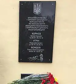 On October 29, 2014, senior sailor Artem Kornev, who had been serving in the 1-FOBMP since 2009, and after the annexation of Crimea, was killed in Talakivka township in the town of Talakivka as part of a combined unit of the Navy of the Armed Forces of Ukraine, which carried out combat missions during the Russo-Ukrainian War. He did not betray his oath and continued his service in Mykolaiv,[14] and lieutenant colonel (posthumously) Yurii Zagrebelnyi.
