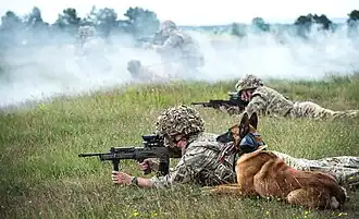 1MWD utilise Patrol dogs, primarily Belgian Malinois and German Shepherds, as a Force Protection asset, providing commanders with a high-profile visual deterrent that can detect, pursue, and detain an intruder with sub-lethal force.[9] Patrol dogs use their superior visual, audio, and olfactory senses to highlight the presence of enemy forces or unidentified personnel within an area of responsibility. They can be employed as static or patrolling sentry, within an ambush, crowd control or as an escort for detainees.[9]