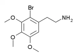 2-Bromomescaline (2-Br-M) is a derivative of the phenethylamine hallucinogen mescaline which has an unusual 2-bromo substitution.[1][2] It is an agonist for serotonin receptors, with a binding affinity of 215 nM at 5-HT1A, 513 nM at 5-HT2A and 379 nM at 5-HT2C, so while it is around ten times more tightly binding than mescaline at 5-HT1A and 5-HT2A receptors, it is over twenty times more potent at 5-HT2C.[3] It has been reported as a designer drug, first identified in Austria in January 2023.[4]