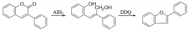 Because there is a substituent at position 2, this benzofuran compound cannot be synthesized by the Perkin rearrangement from a coumarin. However, an alternate sequence has been demonstrated: treatment of 3-phenylcoumarin with aluminium hydride followed by DDQ:[3]